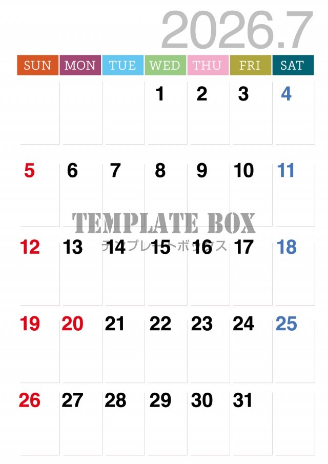 無料テンプレート:2026年7月カレンダー:縦型みやすいカレンダー
