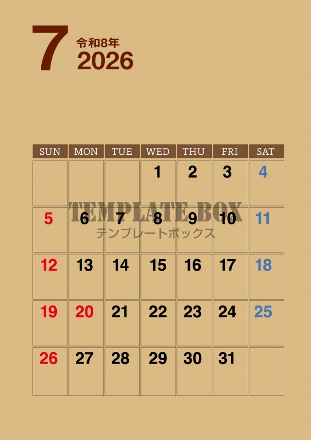 2026年7月カレンダー:縦型ブラウンカラーのカレンダー