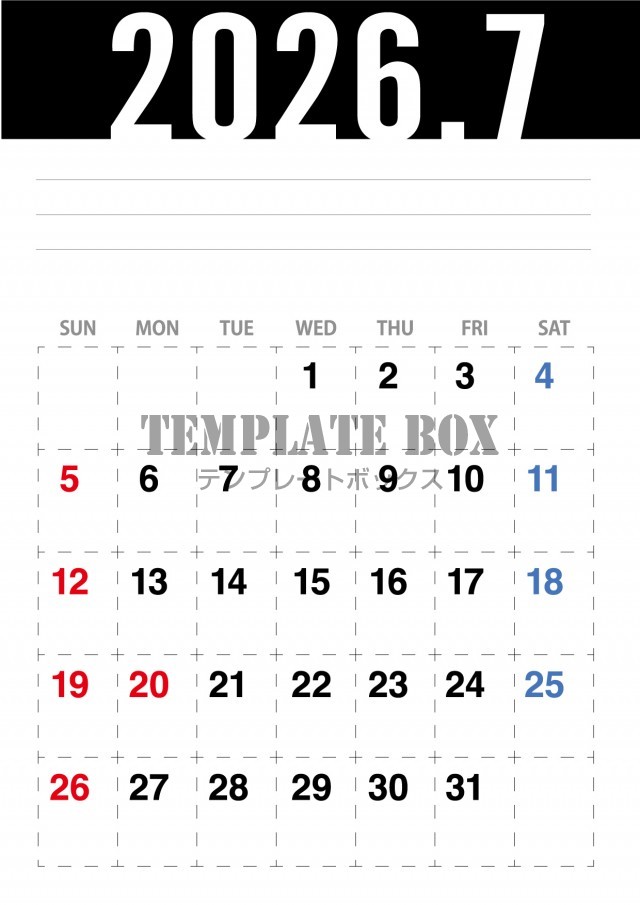 2026年7月カレンダー:大きな数字がみやすいカレンダー