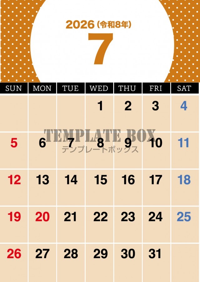 無料テンプレート:2026年7月カレンダー:縦型かわいいカレンダー