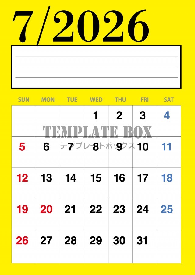 無料テンプレート:2026年7月カレンダー:縦型派手なデザイン