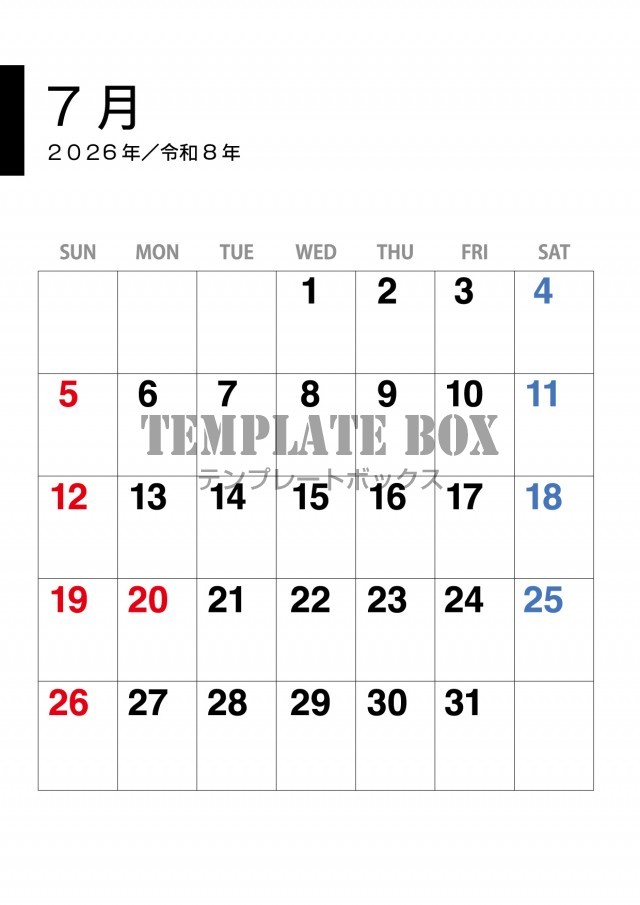 無料テンプレート:2026年7月カレンダー:縦型枠付きカレンダー