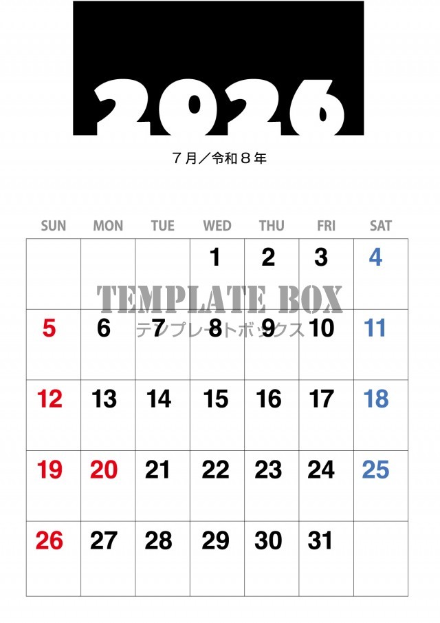 2026年7月カレンダー:大きな数字がみやすいカレンダー