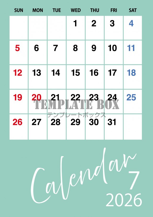 2026年7月カレンダー:縦型大きな数字のカレンダー