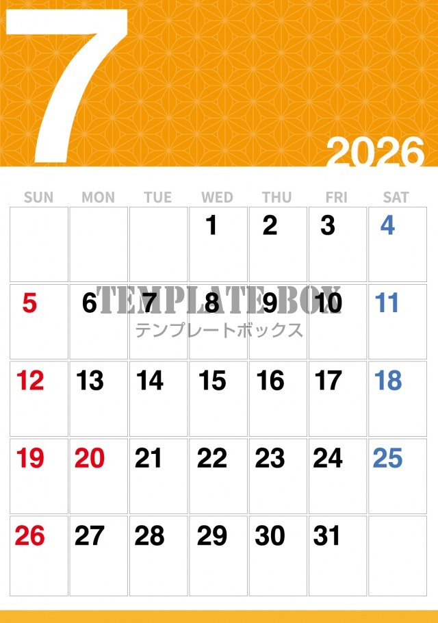 無料テンプレート:2026年7月カレンダー:縦型麻の葉柄カレンダー