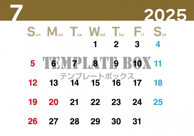 無料テンプレート:2026年7月カレンダー:横型ブラウンカラーカレンダー