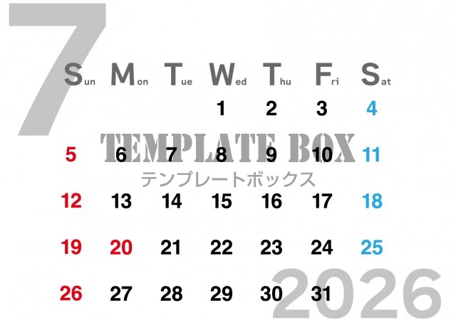 2026年7月カレンダー:横型白抜き文字