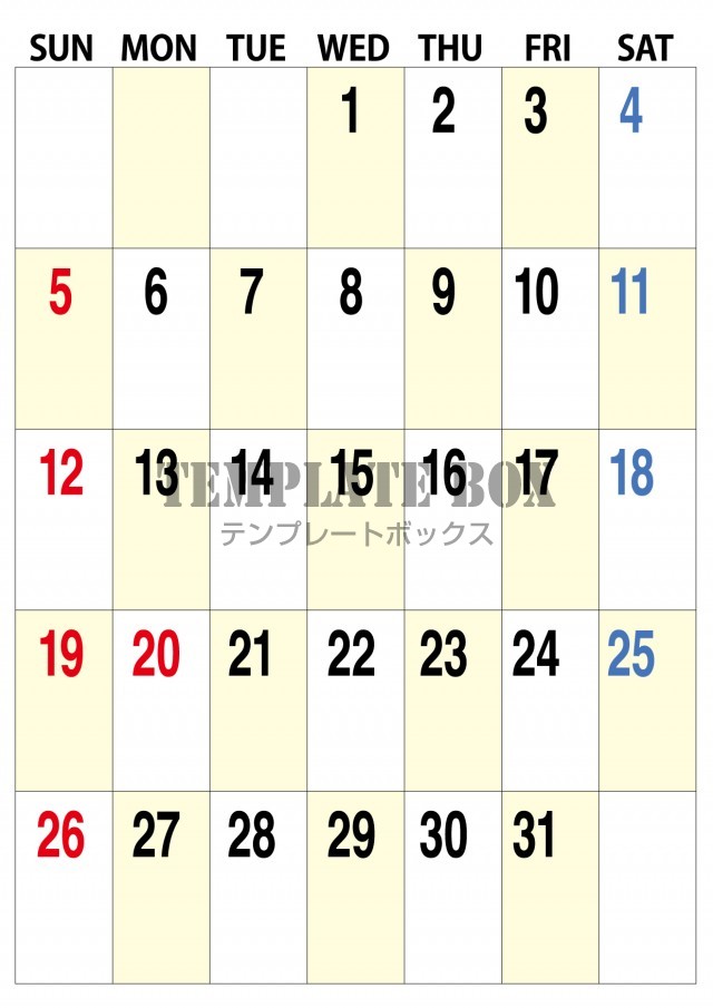 無料テンプレート:2026年7月カレンダー:縦型大きな数字のカレンダー