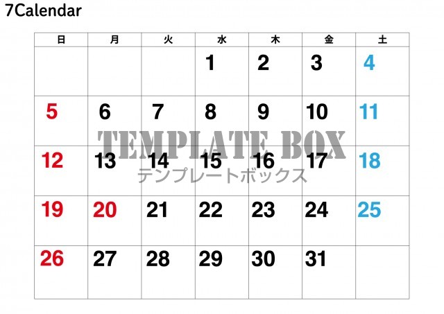 2026年7月カレンダー:縦型大きな数字のカレンダー