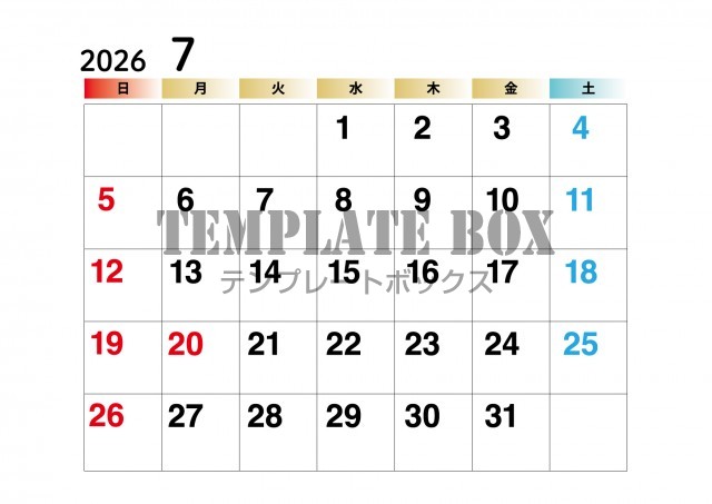 無料テンプレート:2026年7月カレンダー:使いやすいカレンダー