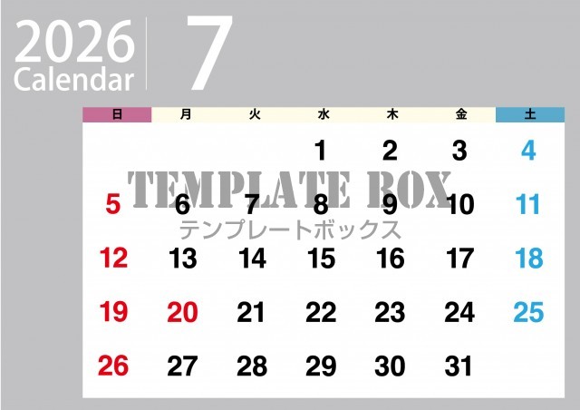 2026年7月カレンダーです。シンプルカラーがおしゃれなデザインのみやす…