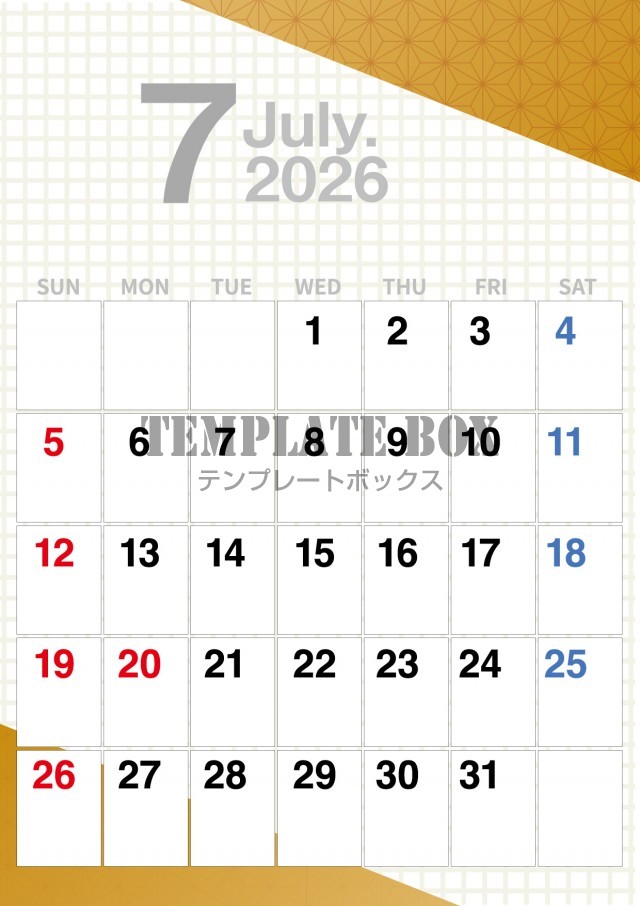 2026年7月カレンダー:縦型麻の葉柄カレンダー