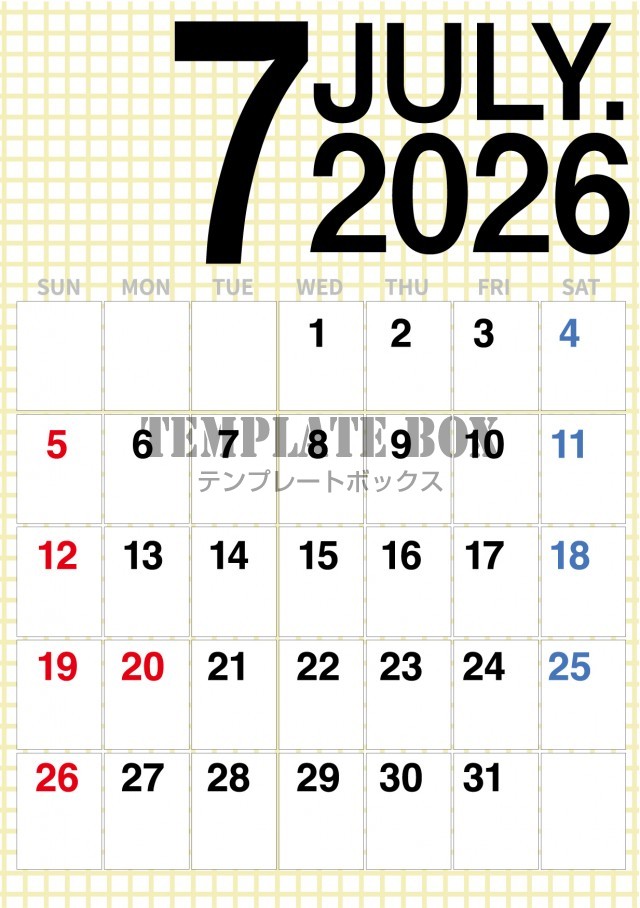 無料テンプレート:2026年7月カレンダー:縦型黄色がかわいいカレンダー
