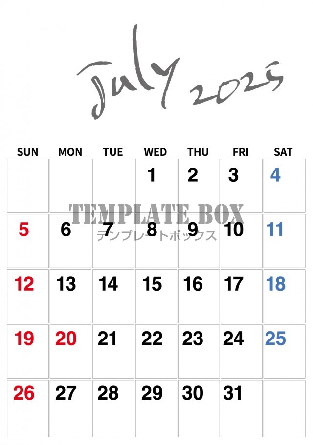 無料テンプレート:2026年7月カレンダー:オフィスに最適カレンダー