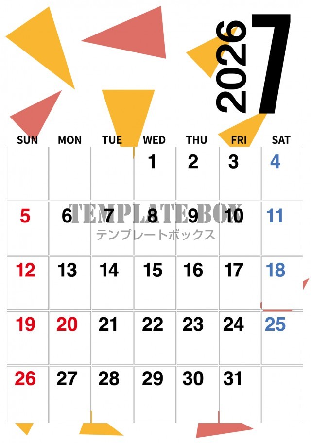 無料テンプレート:2026年7月カレンダー:縦型三角柄カレンダー