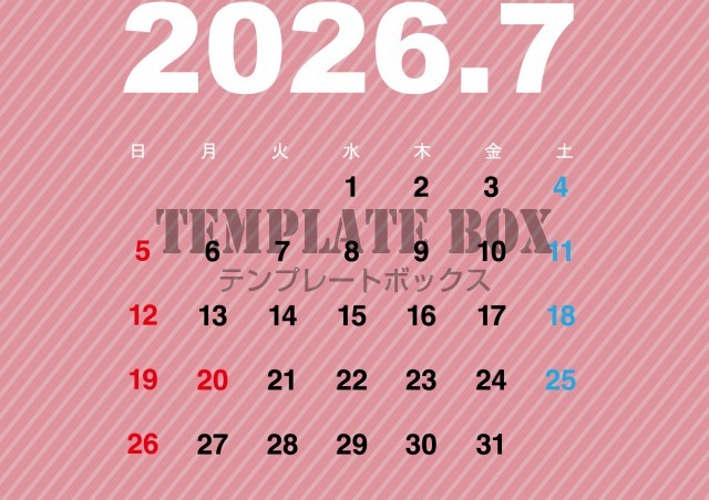 無料テンプレート:2026年7月カレンダー:横型ストライプ柄