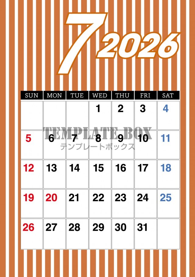 無料テンプレート:2026年7月カレンダー:縦型ストライプ柄使いやすい