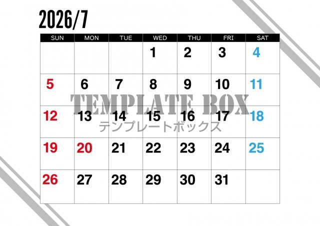 2026年7月カレンダー:横型赤が目立つカレンダー